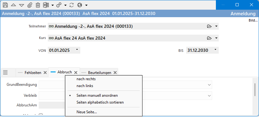 Durch einen rechten Mausklick auf den Reiter der Registerkarte kann die Position innerhalb der Registerkarten dieser Maske festgelegt, das Seitenfelderset verändert oder die Seite wieder komplett gelöscht werden.