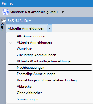 Ansonsten sind “Abbrecher” und “Stornierungen” unter Anmeldungen erklärt; “Nachbetreuungen” sind alle Anmeldungen, deren Teilnahmeende in der Vergangenheit liegt UND die die Eigenschaft “NachbetreuungBis”[Datum] besitzen. Nach diesem Datum verschwinden die dann ehemaligen Nachbetreuten aus dieser Auswahl.