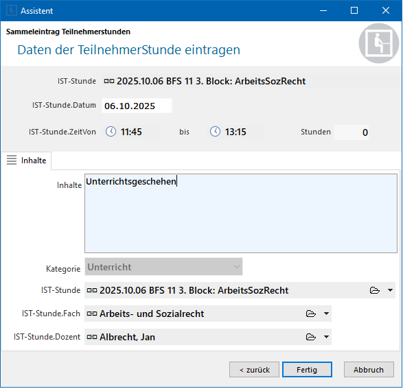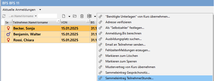 und benutzen dann die Funktion “Sammeleintrag TeilnehmerStunde…”: