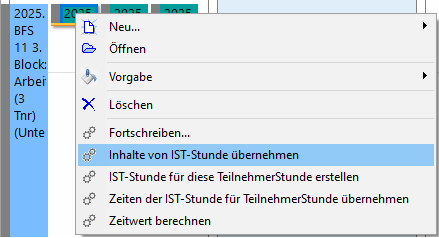 die anschließend identisch bei jedem der ausgewählten Anmeldungen erscheinen. Zur Übernahme des Inhalts aus einer zugrunde liegenden IST-Stunde, benutzen Sie bitte die Funktion “Inhalte von IST-Stunde übernehmen”.