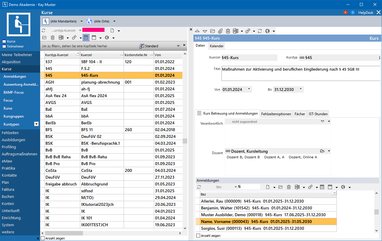 Da das Kürzel an vielen Stellen Verwendung findet, sollten Sie sich eine geeignete Systematik für Ihr Lehrgangsangebot überlegen. Wie der Name schon sagt, sollte das Kürzel möglichst kurz sein und den jeweiligen Kurs eindeutig und treffend bezeichnen. So erkennt man den Kurs beispielsweise in Planausgaben, Listen oder Exporten zweifelsrei wieder. Ein sprechendes Kürzel hilft bei der schnellen Zuordnung von Kursen zu Bereichen und erleichtert es auch den Teilnehmern, sich dieses zu merken.