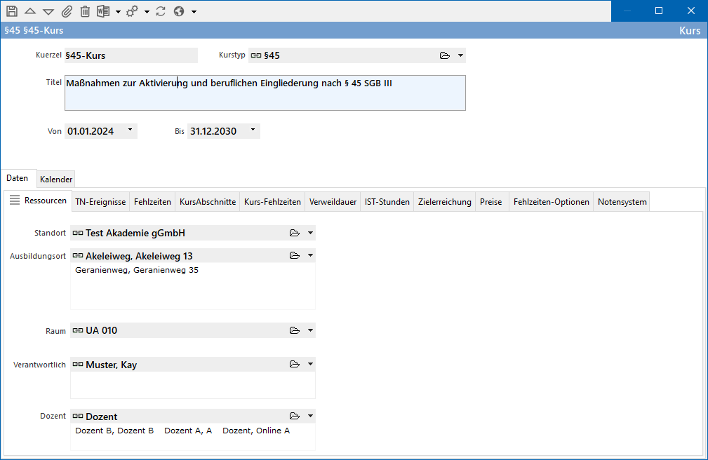 In der Standardmaske eines Kurses finden sich mehrere vordefinierte Registerkarten mit zusätzlichen Informationen. Diese Registerkarten können jederzeit um eigene Registerkarten mit individuellen Angaben ergänzt werden (siehe Handbuch zu den Bedienelementen). Im Register Ressourcen finden Sie (Mehrfach-)Assoziationen zu Ausbildungsort, Dozent und Raum. Eine Liste der Ausbildungsorte kann unter Einrichtung -> Mein Standort angelegt werden.