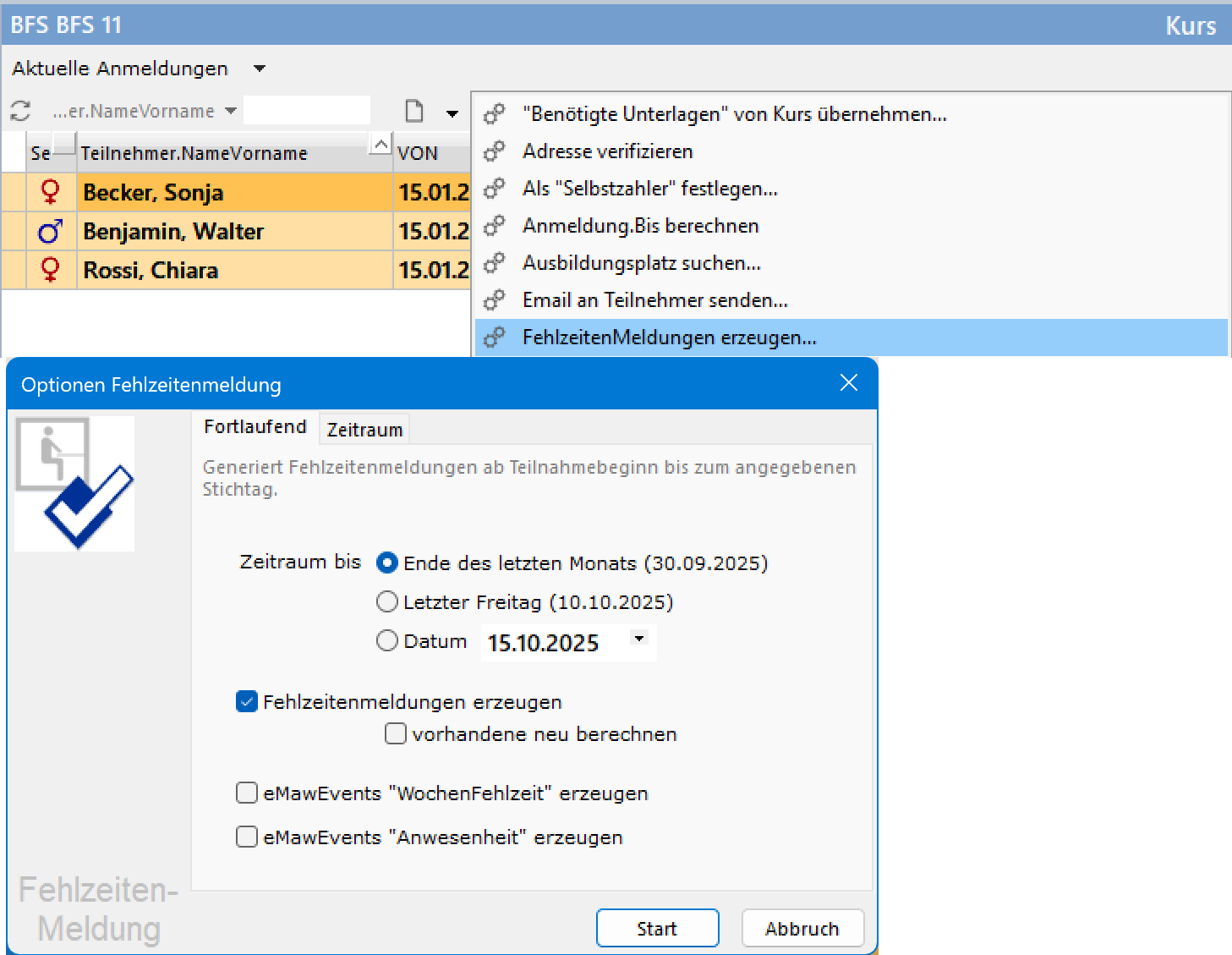Danach legen Sie den Zeitraum fest [letzter Monat, letzte Woche, frei wählbar], um dann “Fehlzeitenmeldungen erzeugen” anzuklicken.