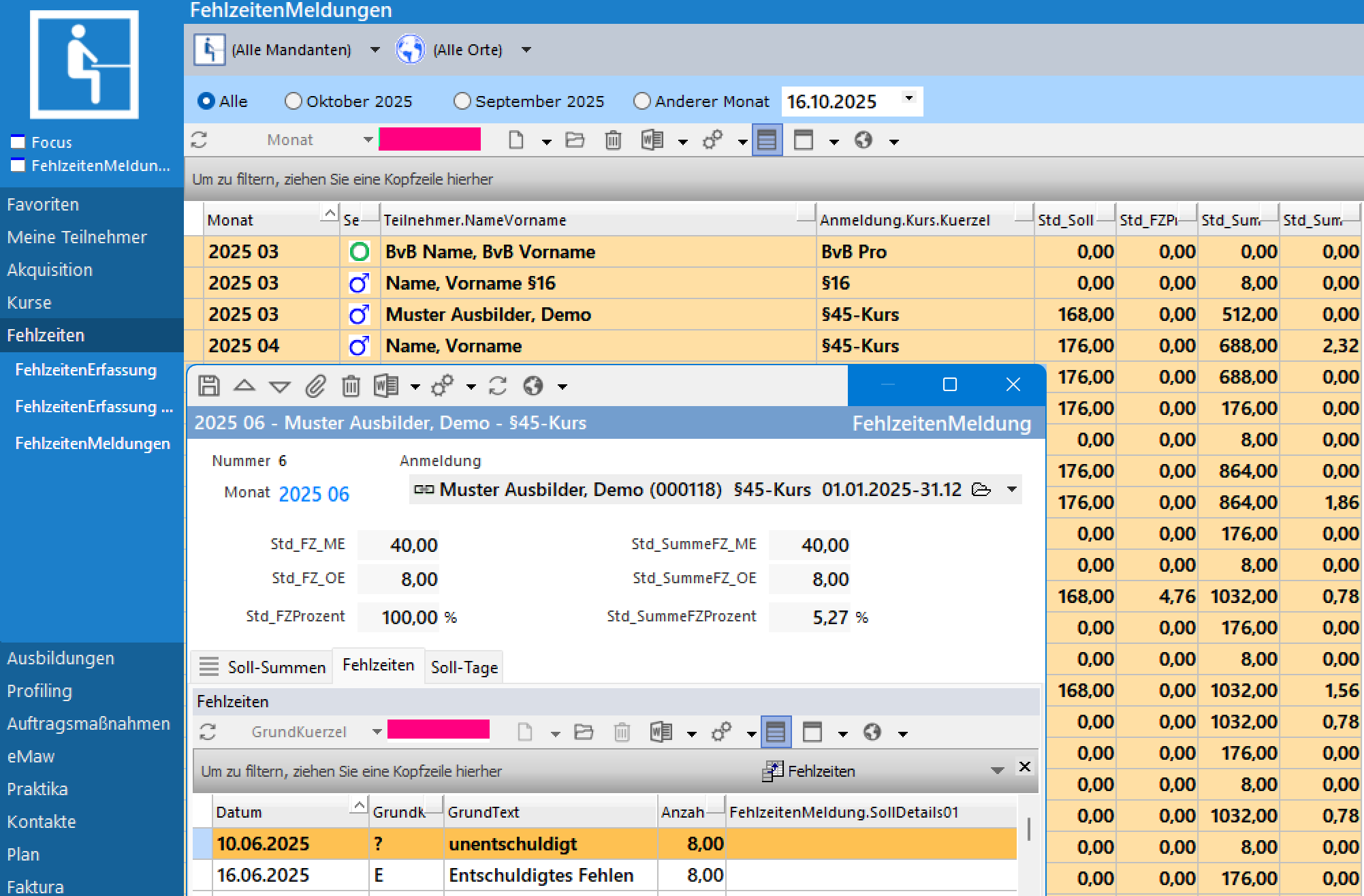In der oberen Hälfte des FehlzeitenMeldung-Fensters sehen Sie, dass es die Meldung aus dem Juni 2025 ist <2025 06> und Sie erkennen in der linken Spalte, dass der Teilnehmer im Juni 40 Std. mit Entschuldigung “Std_FZ_ME” und 8 Std. ohne Entschuldigung “Std_FZ_OE” gleich insgesamt 100% gefehlt hat.