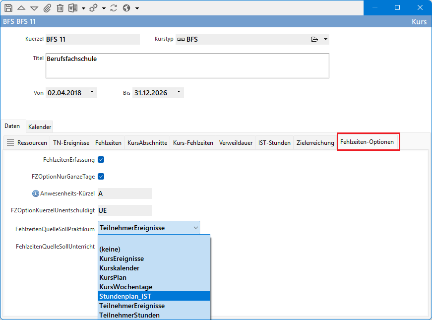 Hierzu wird in der Maske des Kurses eine Registerkarte benötigt, auf der die entsprechenden Fehlzeitenoptionen platziert werden: