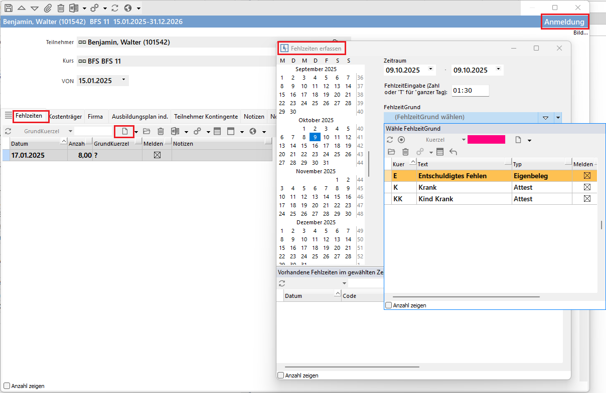 - Das zweite hier sichtbare Fenster “Fehlzeiten erfassen” öffnet sich beim Klicken auf “Neu”. Im Kalender markieren Sie die Fehltage ab, die dann automatisch rechts unter “Zeitraum” stehen. Dann folgt “FehlzeitEingabe” mit den besonderen Eigenschaften: