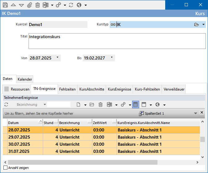 Möchten Sie die täglichen KursEreignisse aus dem KursAbschnitt generieren, so führen Sie die Funktion “KursEreignisse erzeugen” aus: