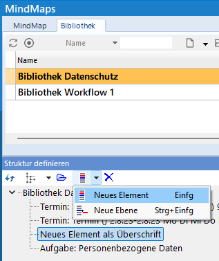 Sie können “neue Elemente”, also weitere Überschriften bzw. Einteilungen anlegen, oder Sie können neue Unterebenen einrichten:
