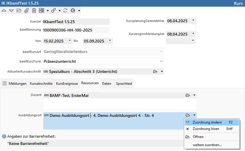 Vergessen Sie nicht, zu dem Kursort (Ausbildungsort) noch Angaben zur Barrierefreiheit zu machen: