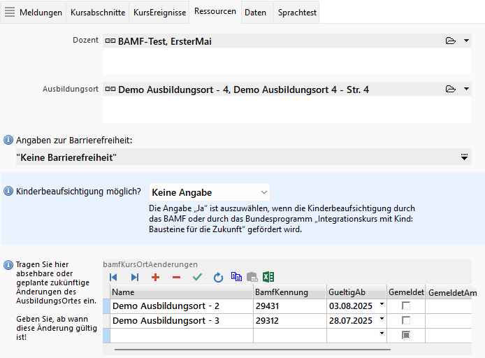 Tragen Sie den Kursort-Namen, dessen BAMF-Kennung sowie das GültigAb-Datum ein. Den Rest der Felder lassen Sie bitte unberührt! Hier erfolgen die Eintragungen automatisch durch ABES/Objects. Dann aktualisieren Sie den KursAbschnitt per Meldung.