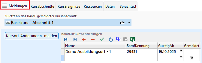 Wieder tragen Sie den neuen Kursort in die o.g. Tabelle (unter Register “Ressourcen”) ein. Wenn Sie dann zum Register “Meldungen” wechseln, nehmen Sie diesmal keine KursAbschnittsAktualisierung vor, sondern klicken auf “Kursort-Änderung melden”.