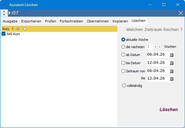 Nachdem Sie den Kurs ausgewählt haben, in dem etwas gelöscht werden soll, treffen Sie noch wichtige Einstellungen zum zeitlichen Umfang der Planlöschung auf der rechten Seite, um dann mit einem Klick auf “Löschen” die gewünschte Funktion auszuführen.