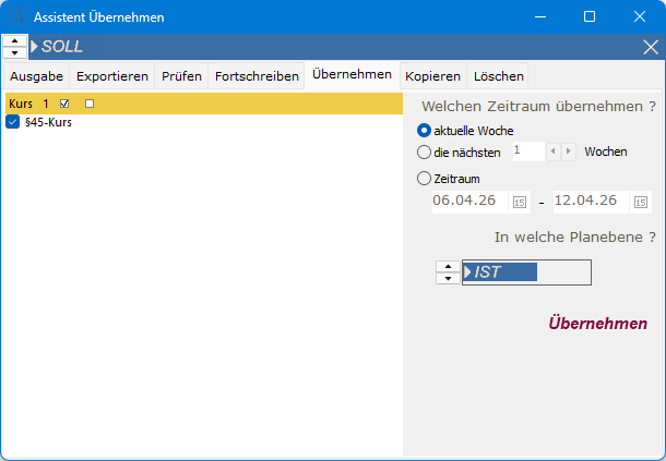 Übernehmen bedeutet, Stundenpläne zwischen den drei Planebenen “PLAN”, “SOLL und “IST” eines Kurses zu kopieren.