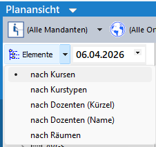 aufgerufen. Auf welche Objekte (Kurse, Dozenten, Räume) die entsprechenden Funktionen angewandt werden, hängt davon ab, welche Sie als “Elemente” aufrufen. (s. Bild) Sind Sie z.B. noch direkt in einem Kurs, werden die Funktionen auch nur auf diesen Kurs bezogen. Haben Sie Ihre Sortierung auf Kurse eingestellt und klicken Kurse an, beziehen sich die Funktionen auf alle Kurse. (s. Bild) Haben Sie Kurstyp eingestellt und klicken einen Kurstyp an, beziehen sich die Funktionen auf die Kurse des Kurstyps.