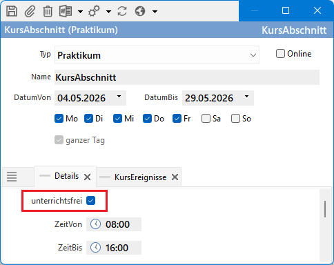 Sollten Sie nun aus bestimmten Gründen in diese Phasen doch etwas fortschreiben wollen, so müssen zunächst bei den entsprechenden Kursabschnitten bzw. betreffenden Kursereignissen die Eigenschaft “unterrichtsfrei” ausschalten: