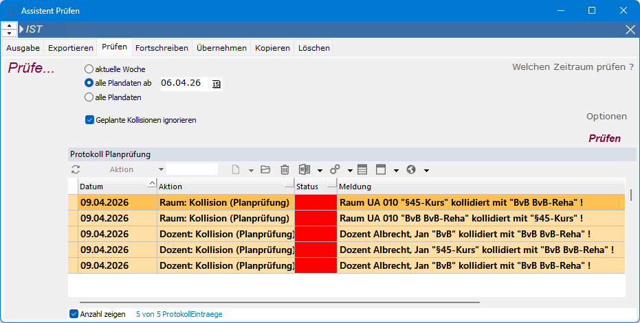 Prüfen ist die Kontrolle, ob nicht eventuell in Bezug auf Dozenten oder Räume eine Doppelplanung vorliegt.