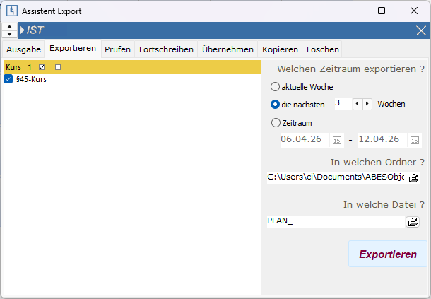 Wie gewohnt sehen Sie auf der linken Seite die Kurse, für die die Plandaten exportiert werden sollen. Wählen Sie dann, ob