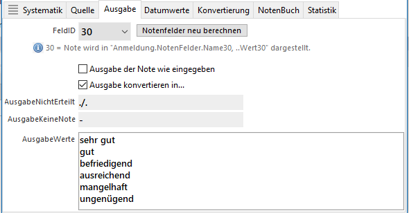 In der Registerkarte “Ausgabe” können Sie die entsprechenden Ausgabewerte für eine Notendefinition hinterlegen.