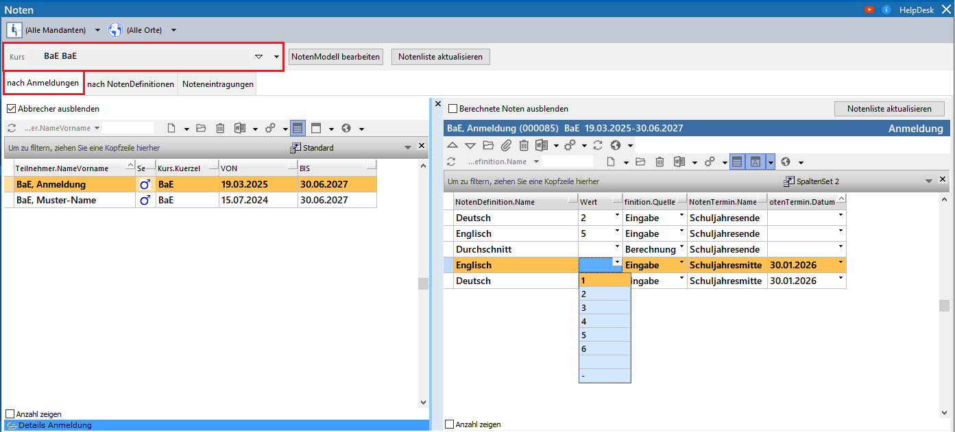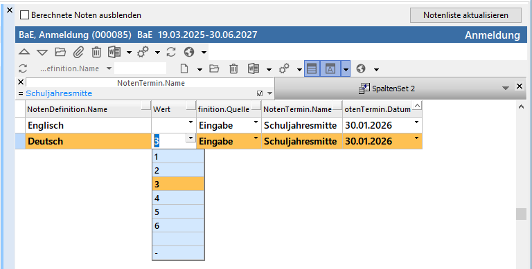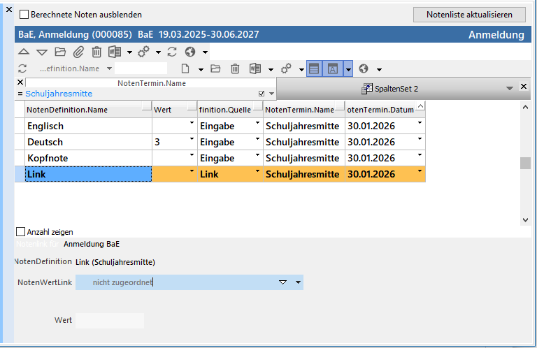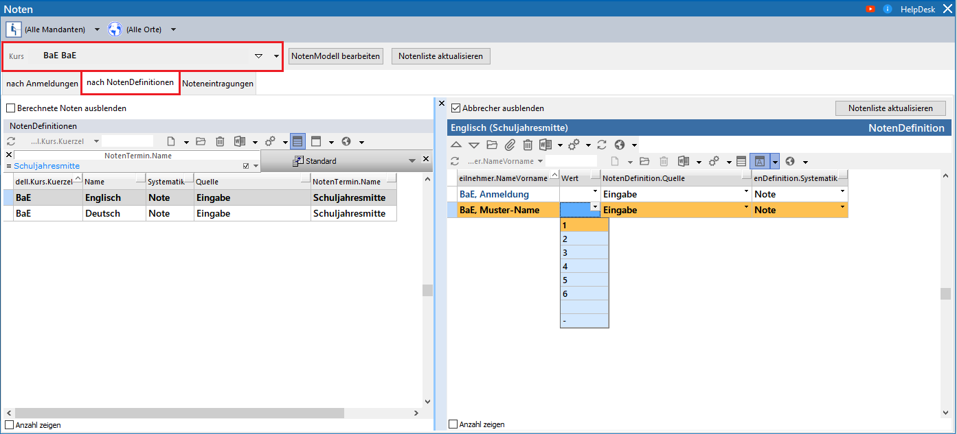 Links sind die NotenDefinitionen bereits nach einem NotenTermin gefiltert. (Schuljahresmitte)