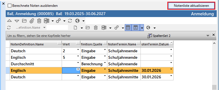 2. Notenliste aktualisieren