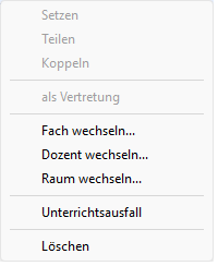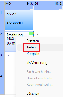 Als erstes setzen Sie die Unterrichtseinheit für den ersten Teil der Teilnehmer wie gewohnt. Anschließend klicken Sie den Dozenten an, der mit dem anderen Teil des Kurses arbeiten soll. Das kann im gleichen aber auch in einem anderen Fach oder Raum desselben Kurses sein. Zeigen Sie nun mit dem Mauszeiger auf den Block, den Sie teilen wollen, klicken Sie mit der rechten Maustaste und wählen Sie “Teilen”. Sie erhalten nun folgendes Bild: