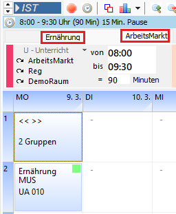 Im betreffenden Block wird angezeigt, dass der Kurs in diesem Block in zwei Gruppen geteilt wurde. Informationen darüber, welche Dozenten in welchen Fächern bzw. Räumen mit den anderen Gruppen arbeiten, erhalten Sie durch Klicks auf die entsprechenden Register, auf denen oben schon das Fachkürzel steht.