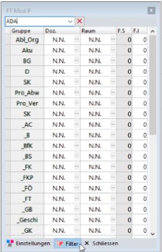 Sie klicken unten “Filter” an, oben im Planassistenten erscheint ein Eingabefeld, in das Sie Buchstabenfolgen des gewünschten Fachnamenkürzels (Spalte: Gruppe) schreiben.
