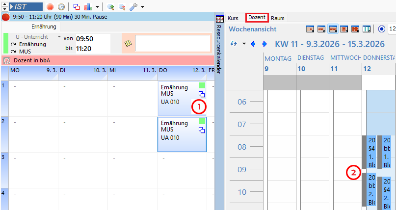 2. Die doppelte Planung des Dozenten, hier in der rechten Bildhälfte (Ressourcenkalender) zu sehen: