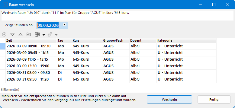 Haben sich Umstände oder Absichten geändert, kann es notwendig werden, vor allem Dozenten und Räume ab Tag X für alle folgenden Wochen zu wechseln. Am schnellsten funktioniert das folgendermaßen: